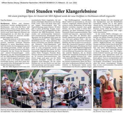 Zügig ging es durch die verschiedenen Genres. Das war alles in allem satter BigBand Sound, super präzise gespielt. Ohne Zugaben gings da niemand von der Bühne. Das Publikum dankte mit dem Lohn des Künstlers. Applaus, Applaus Investition für die Zukunft Ein Herzenswunsch noch von Werner Simon im Jubiläumsjahr: „Interessierte Kinder und Jugendliche sind bei uns immer herzlich willkommen. Als Investition der nächsten hundert Jahre.“ Michael Schäfer Freier Autor, Mannheimer Morgen 24.7.2023